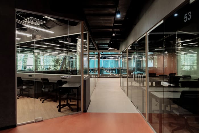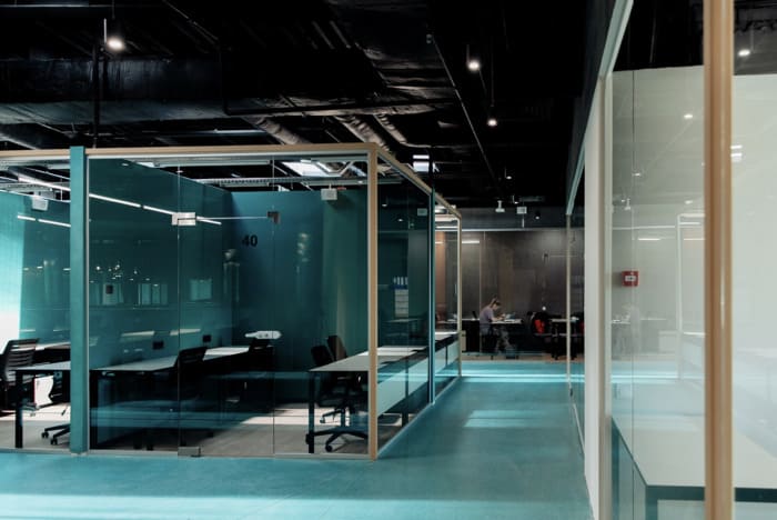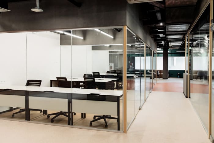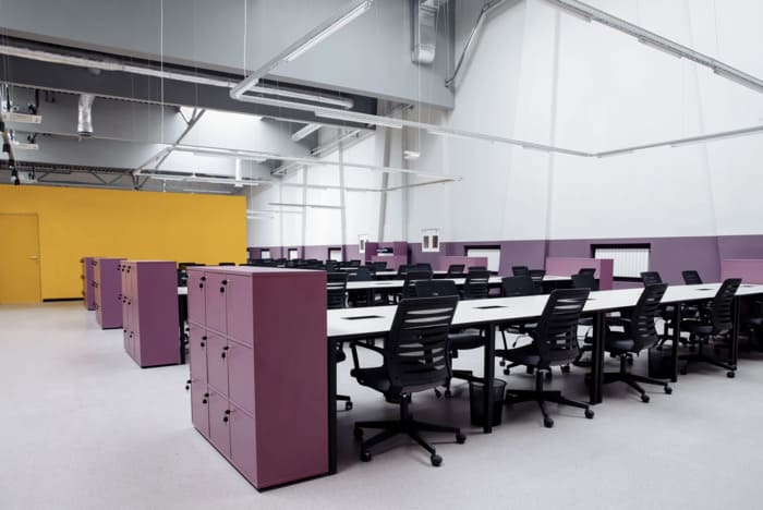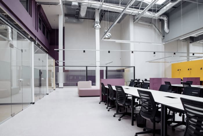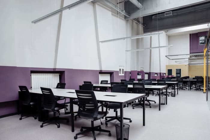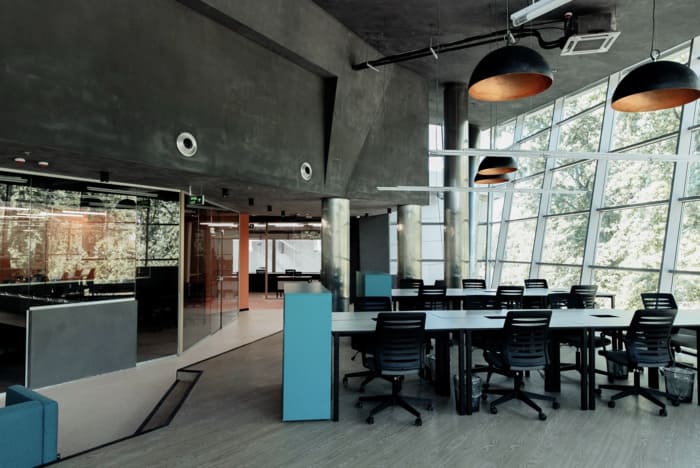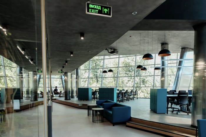 Сам простір дуже гарний у стилі хайтек – високі стелі з трубами та витяжками, багато скляних перегородок, пастельні кольори на стінах, багато світла. Робочі місця обладнані великими столами та зручними стільцями. На кухні можна зробити собі каву або чай, почастуватись снеками, а в перерву пограти у відеоігри чи настільний теніс у релакс зоні.