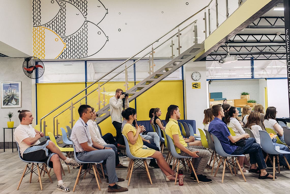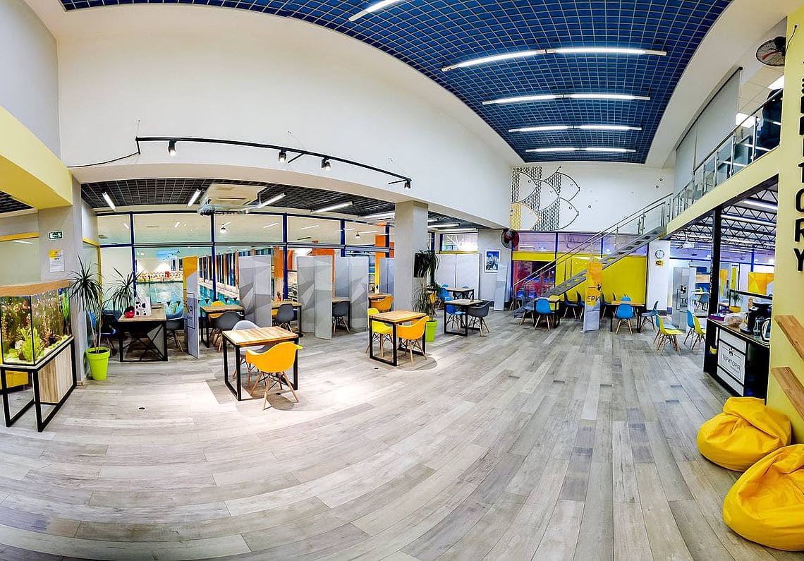 Щодо атмосфери – це велике приміщення з високими стелями, гарним ремонтом, великими вікнами з видом на басейн в аквапарку. Коворкінг обладнаний всім необхідним для роботи, окремі столи та стільці в опенспейсі, високошвидкісний інтернет, окремі переговорні кімнати, також є кімната для проведення презентацій та різних івентів.